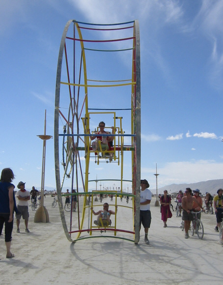A rolling Ferris wheel. Three people sit inside and pedal to make it go. Anyone can take a turn. Click to enlarge